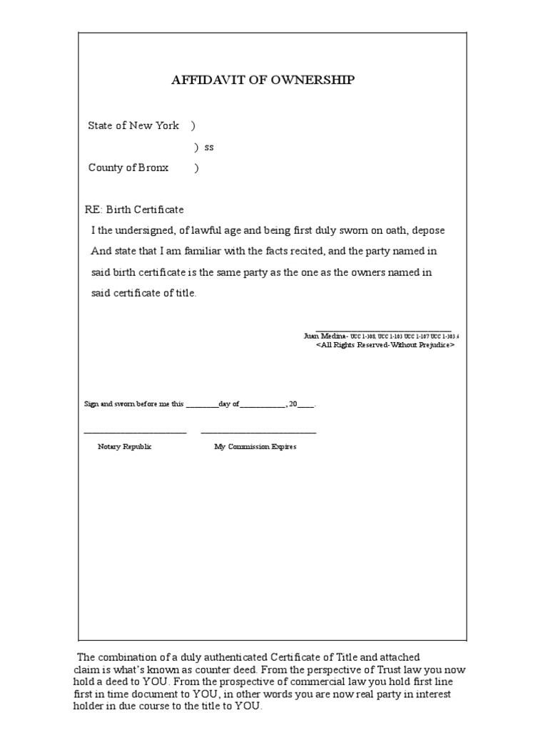 This affidavit of ownership for a birth certificate is a legal document that establishes the ownership and authenticity of a birth certificate. It might be completed by a parent, relative, or medical professional who was a witness to the birth if a birth certificate cannot be found. Affidavit of ownership of certificate of title for benefit of owner i, _____, the affiant, of lawful age and being first duly sworn on oath,.