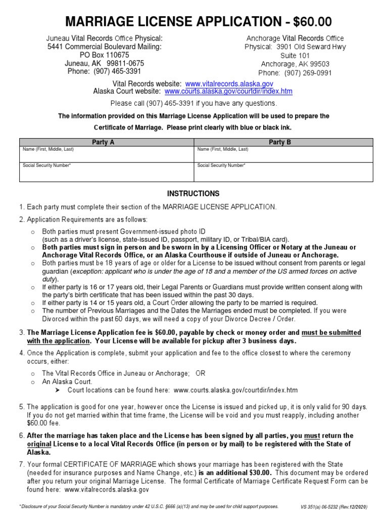 Learn how to get a marriage license, a marriage commissioner appointment, and perform a marriage ceremony in alaska. Alaska marriage certificate request form; Less information is found on. The completed marriage license must be mailed to the juneau. More marriage information is usually found on the marriage license application or the marriage register.