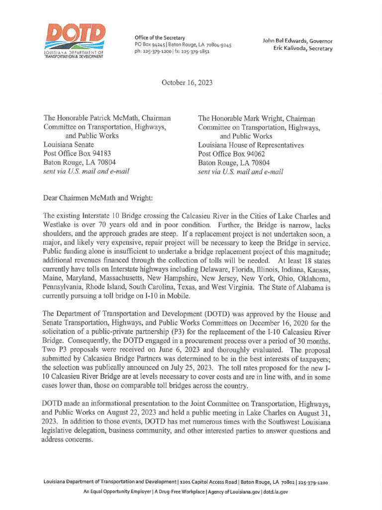Secretary Kalivoda's Letter To The Transportation Committee About