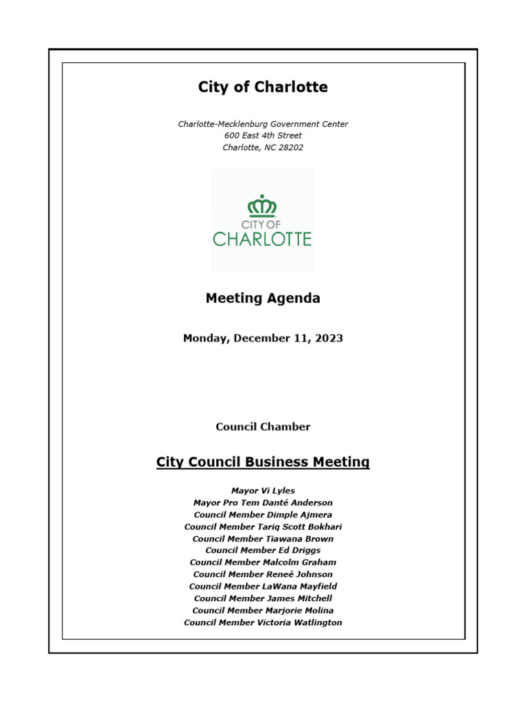 City council business meeting meeting agenda march 13, 2023 13. Agendas, past and present how to access agendas from charlotte city council meetings.