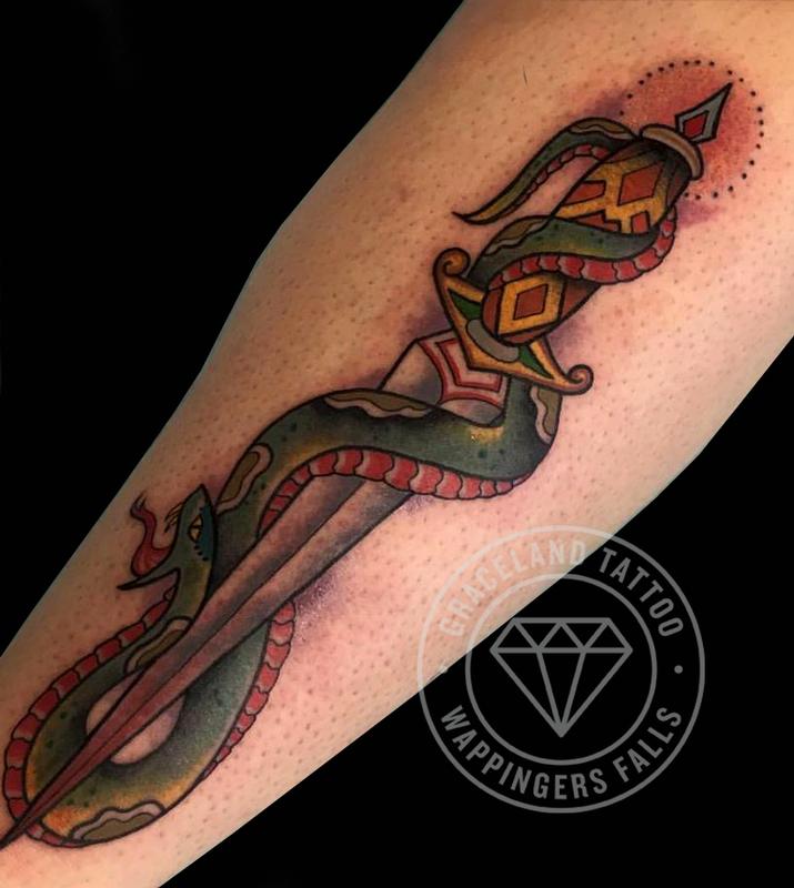 A Snake wrapped around a Knife displayed in NeoTraditional. tattoos