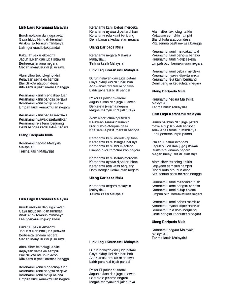 Keranamu malaysia ( lirik lagu ) buruh, nelayan dan juga petani. Lirik lagu keranamu malaysia adalah sebuah lagu patriotik yang mengungkapkan kebangsaan dan kejayaan rakyat malaysia.