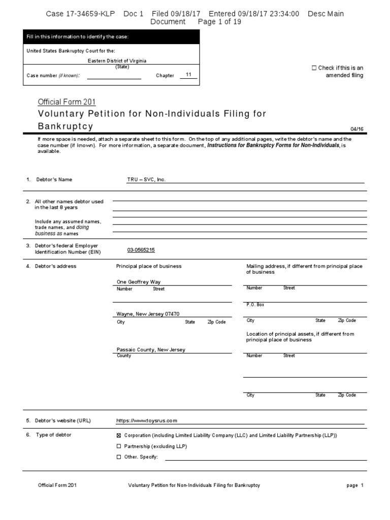 Toys R Us Bankruptcy Filing PDF Chapter 11 Bankruptcy