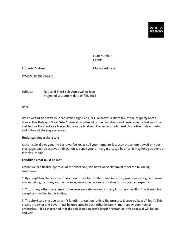Wells Fargo FHA PreForeclosure Short Sale Approval Letter Short Sale